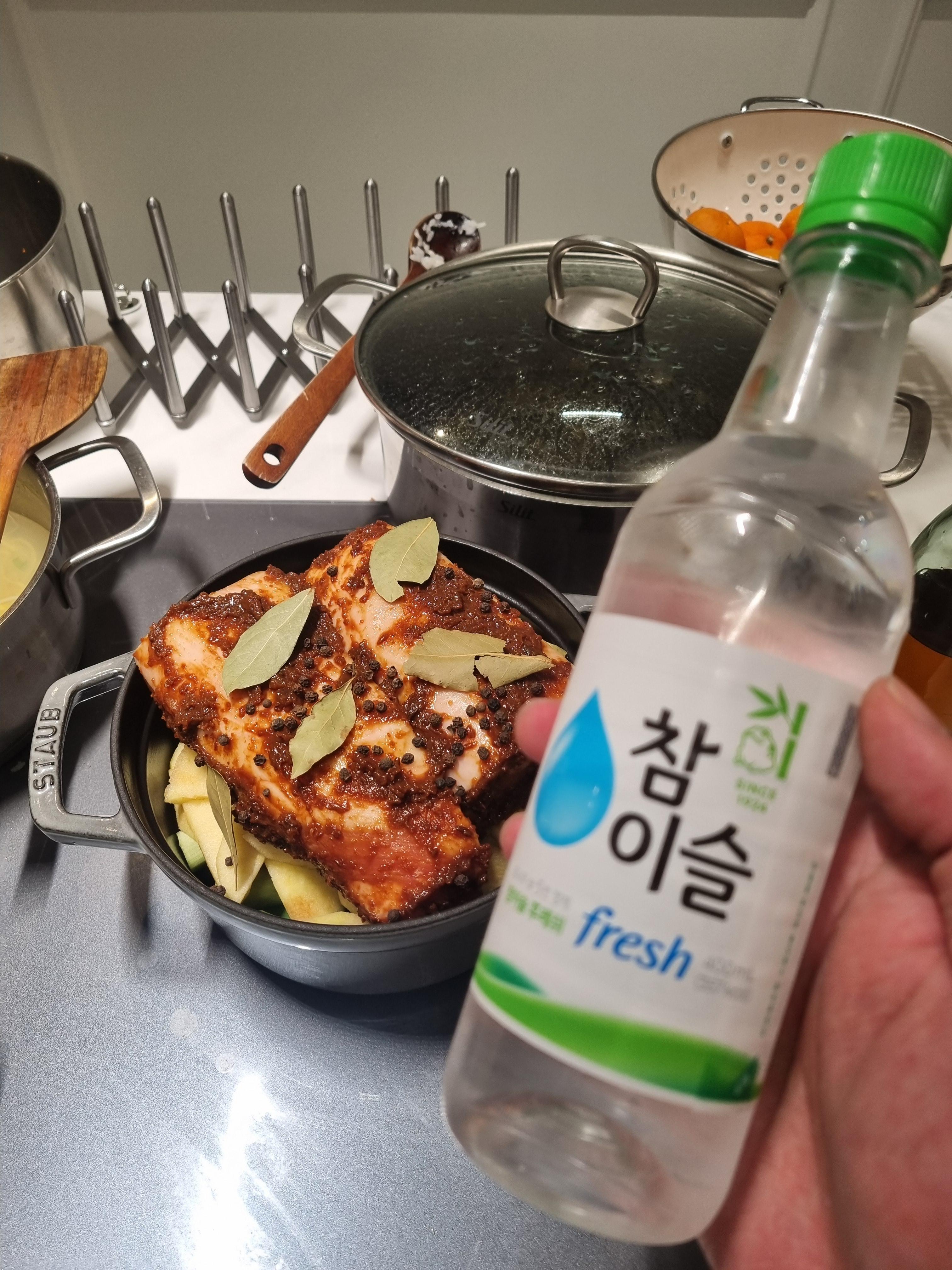 월계수잎 조금, 통후추 조금, 소주 또는 청주 반컵