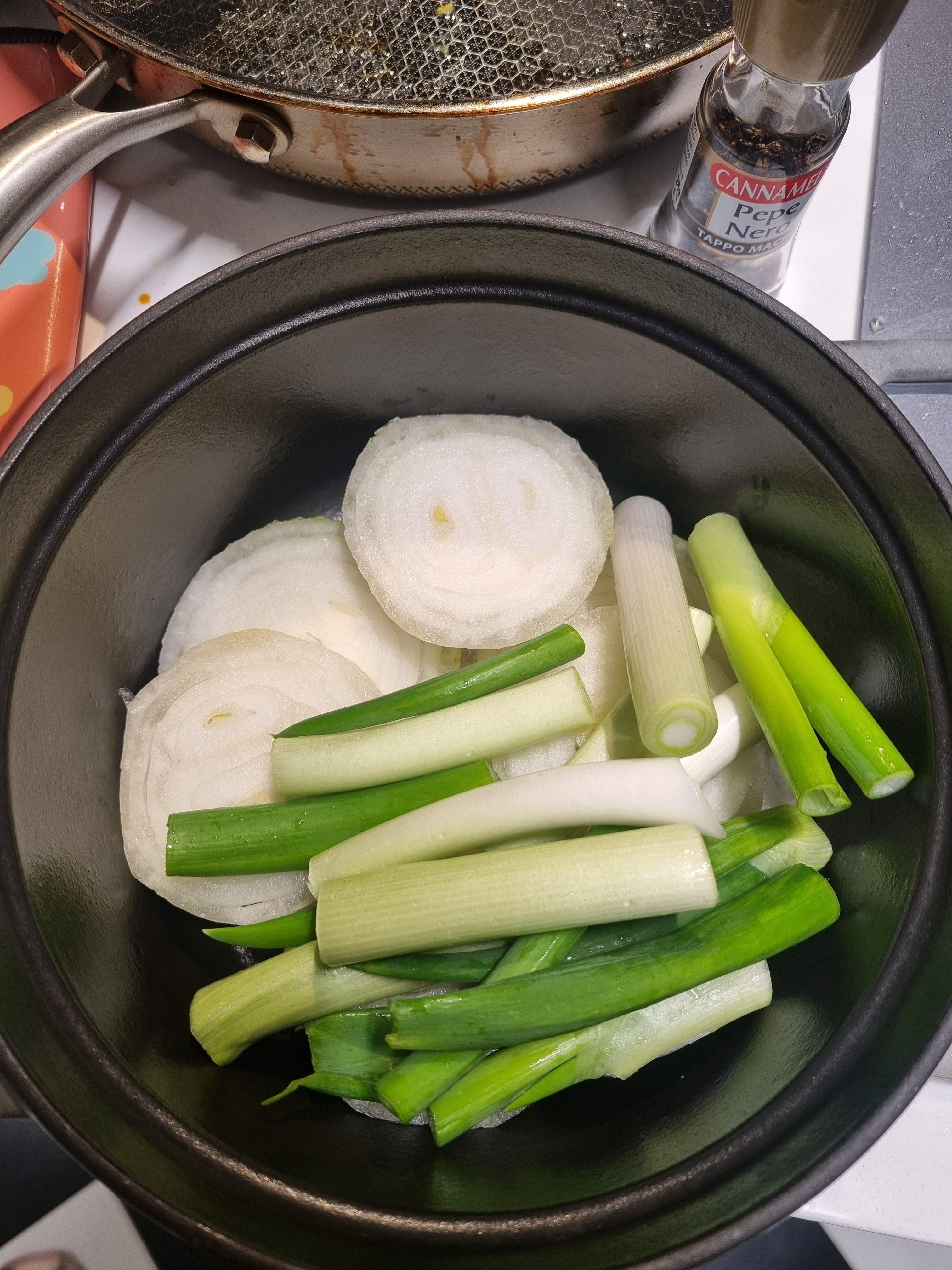 3. 삶는 재료 : 양파 2개, 대파 1대,