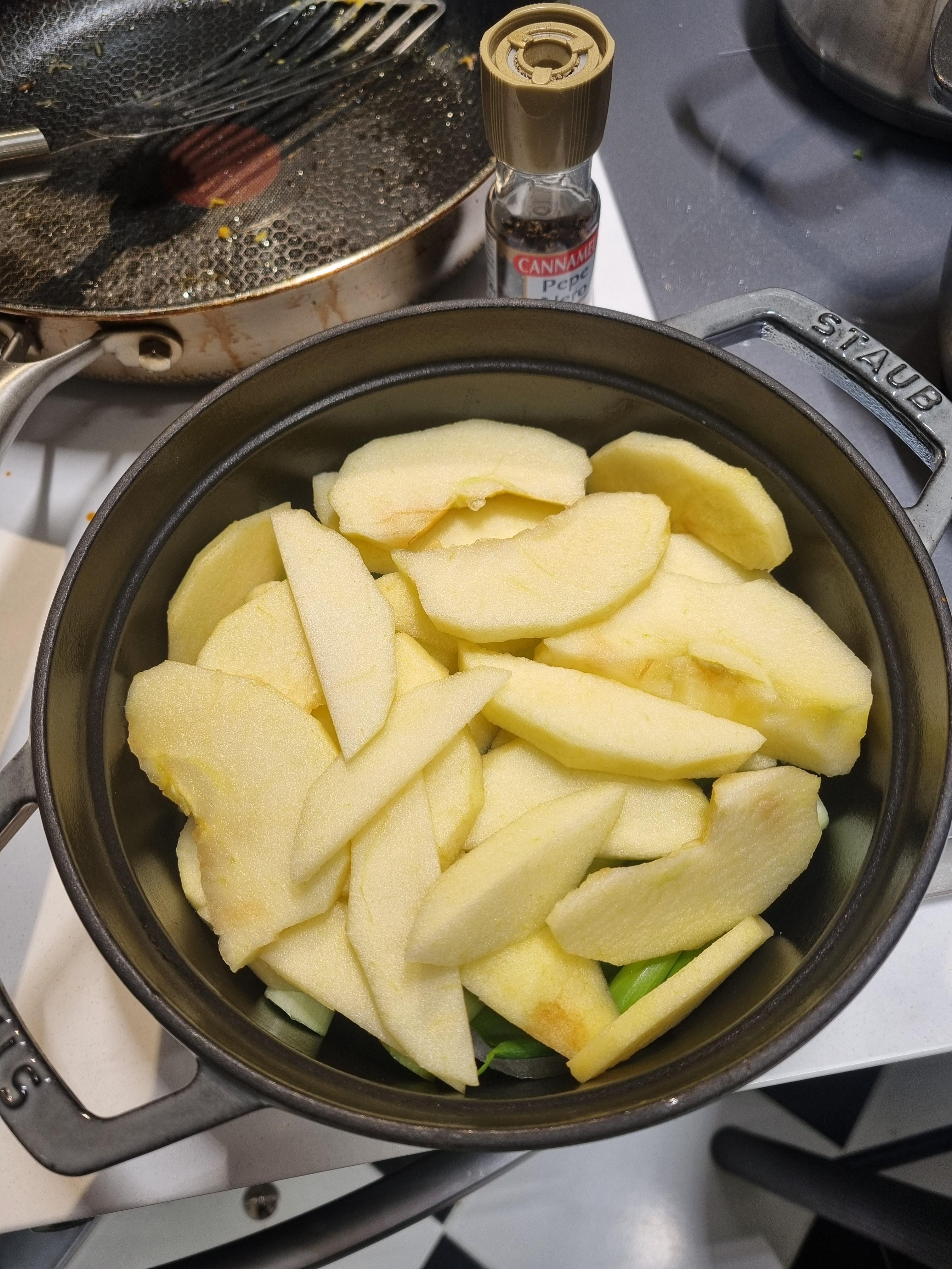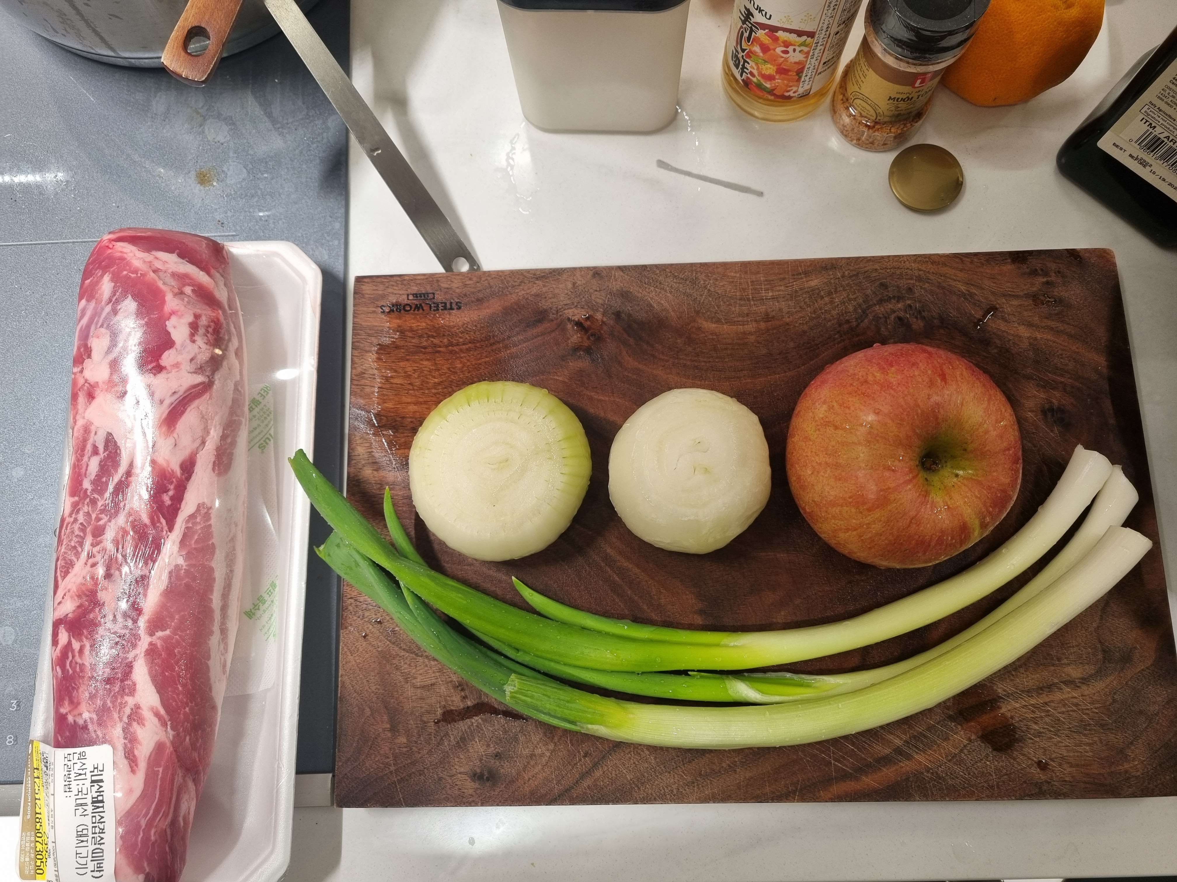 3. 냄비에 양파 > 대파 > 사과 또는 배를 깔고,