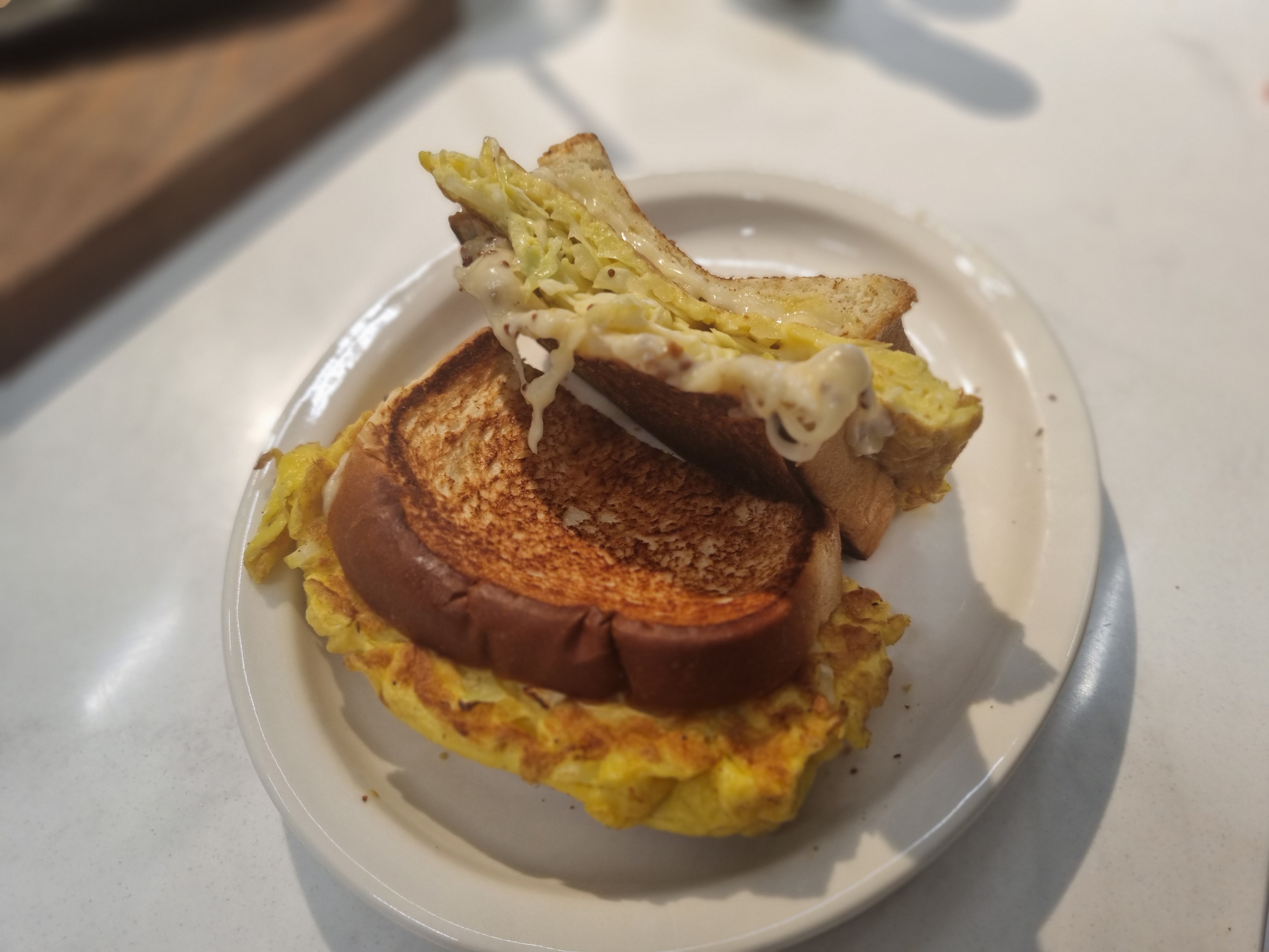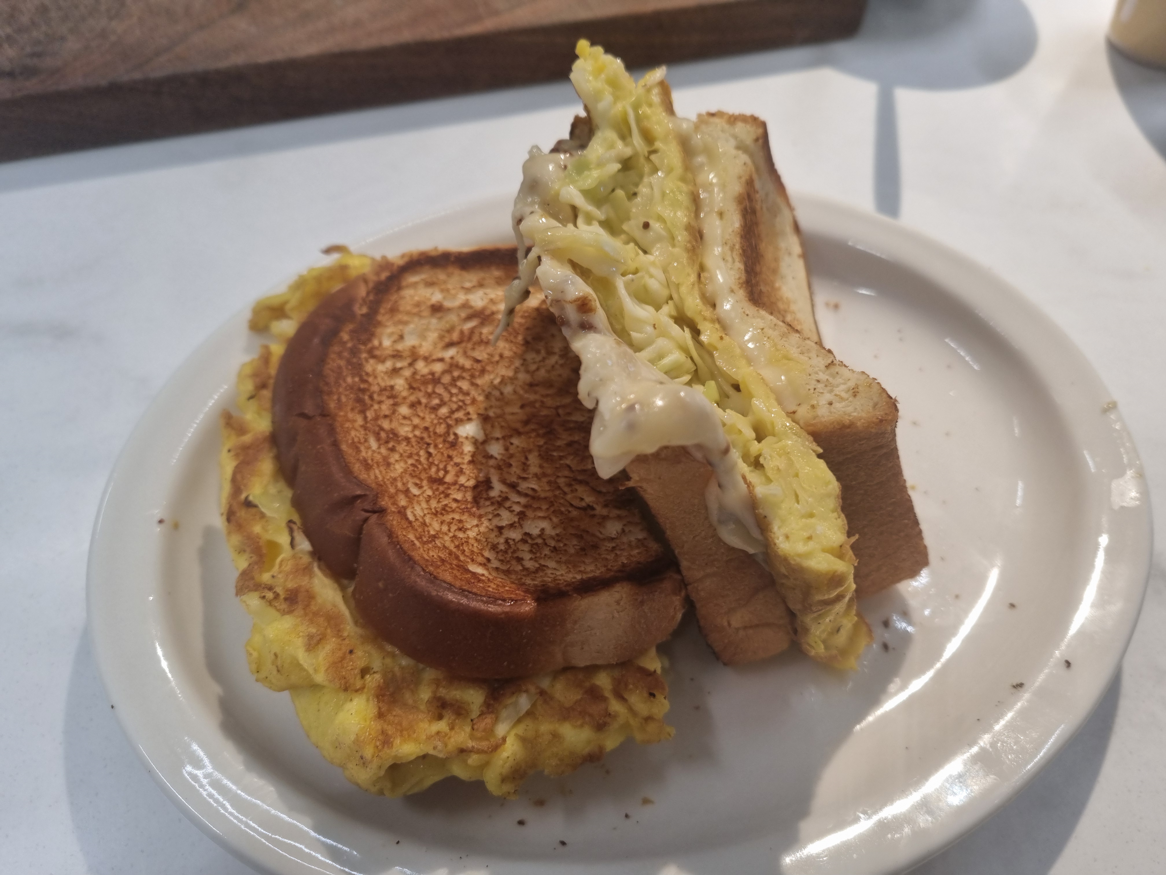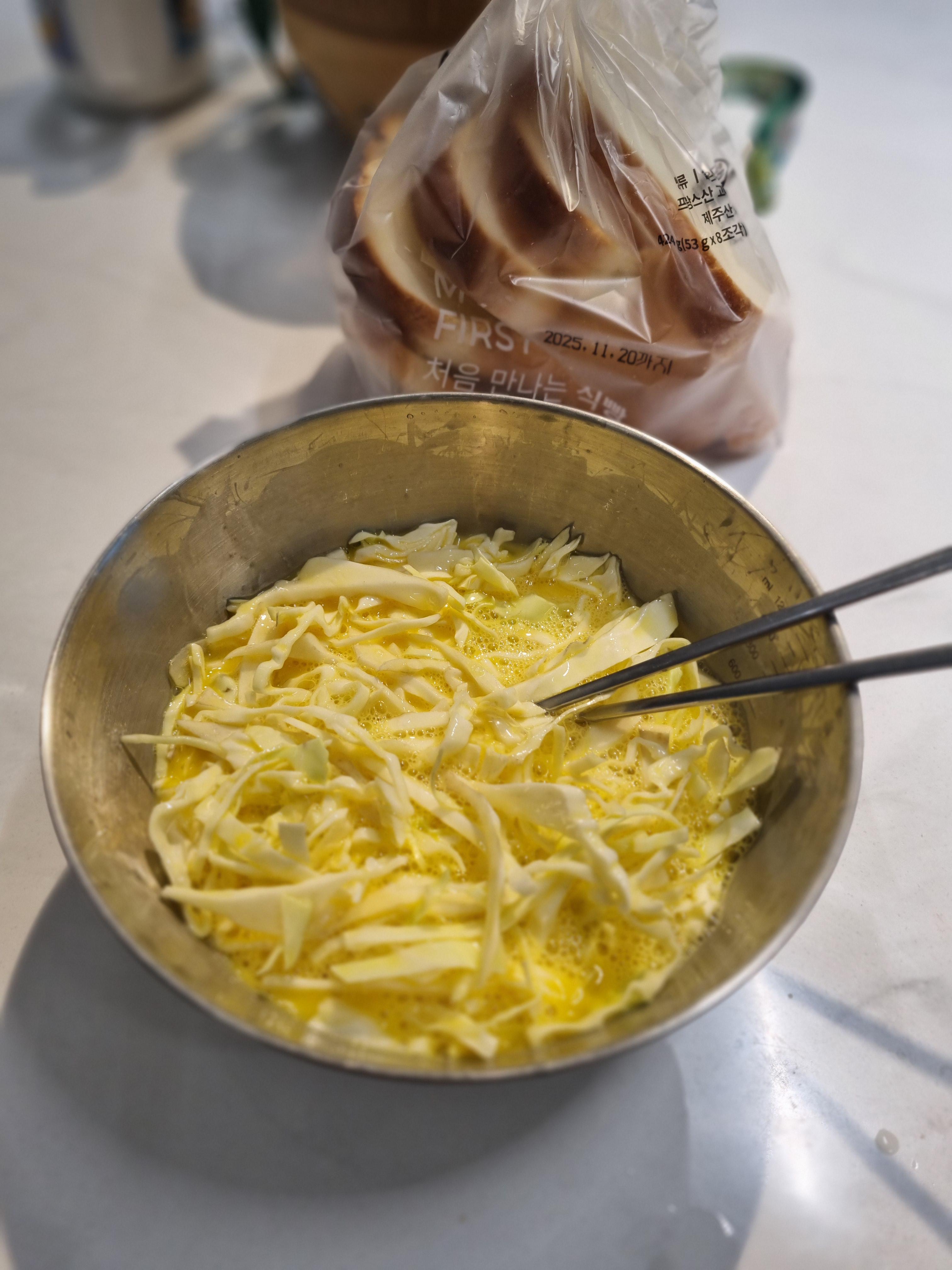 계란, 채썬 양배추, 식빵, 치즈 + α